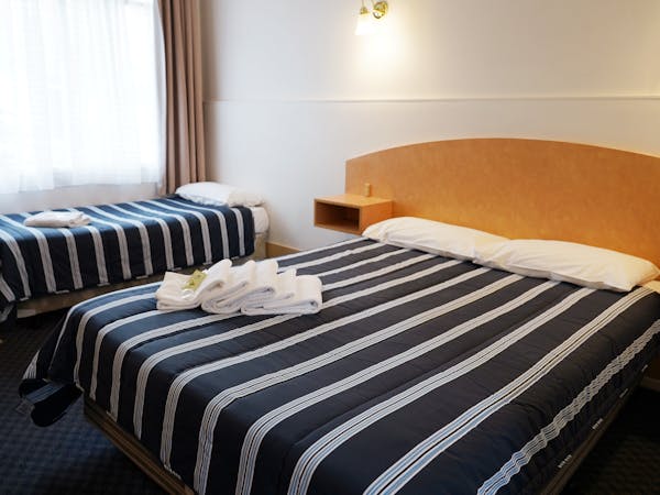 Our Twin Share room features a Queen bed and a single bed. The rack rate advertised is for 2 adults, $20 extra for the 3rd person. Room facilities include LED smart TV, microwave, toaster and tea and coffee making.